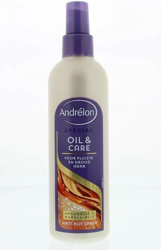 Deze Andrelon Anti Klit Spray Oil & Care is speciaal voor droog en pluizig haar wat vaak last heeft van klitten. Deze spray zorgt dat het haar weer zacht wordt en na gebruik weer makkelijk doorkambaar is. Door de lichtgewicht formule blijft de luchtigheid in je haar behouden en zorgt het ervoor dat je haar niet zwaarder aan gaat voelen. De anti-klit spray geeft je haar bescherming tegen toekomstige beschadigingen van onder andere stylingsproducten, de hitte van de föhn, de stijltang of het borstelen van je haar. Maar het gaat pluis ook tegen bij gebruik van een borstel of van de föhn.