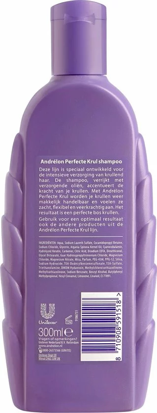 Andrélon Perfecte Krul is speciaal ontwikkeld voor de intensieve verzorging van krullend haar. De shampoo, verrijkt met arganolie, accentueert de kracht van je krullen. Met Andrélon Perfecte Krul worden je krullen weer makkelijk handelbaar en voelen ze zacht, flexibel en veerkrachtig aan. Het resultaat is een perfecte bos krullen. Gebruik voor een optimaal resultaat ook de andere producten uit de Andrélon Perfecte Krul lijn. Tip: Gebruik je regelmatig stylingsproducten? Was dan je haar twee keer achter elkaar om het extra goed te reinigen. Tip: Na het wassen staan je haarschubben open. Gebruik een conditioner om je haarschubben weer te sluiten. Je haar wordt zo beter beschermd. Deze fles is 100% recyclebaar, gooi de fles dus weg bij het plastic afval. Andrélon is het meest verkochte haarverzorgingsmerk in Nederland. Met een uitgebreid assortiment shampoos, conditioners en stylingproducten biedt Andrélon je een uitgebreide verzorging voor elk type haar. Andrélon kent een rijke geschiedenis van meer dan 75 jaar: ooit maakte kapper André de Jong zijn eigen verzorgingsproducten in een klein fabriekje naast zijn winkel in Bodegraven. In 1940 registreerde hij zich bij de Kamer van Koophandel en Fabrieken in Bodegraven. Parfumerie Andrélon was geboren en in de daarop volgende 75 jaar ontwikkelde het zich als een landelijk bekend merk voor haarverzorging. Innovatie is voor Andrélon haarverzorgingsproducten altijd een belangrijke leidraad geweest. Van de introductie van de onderscheidende schubbenfles tot de steeds vernieuwende formules van de shampoos & conditioners zelf.