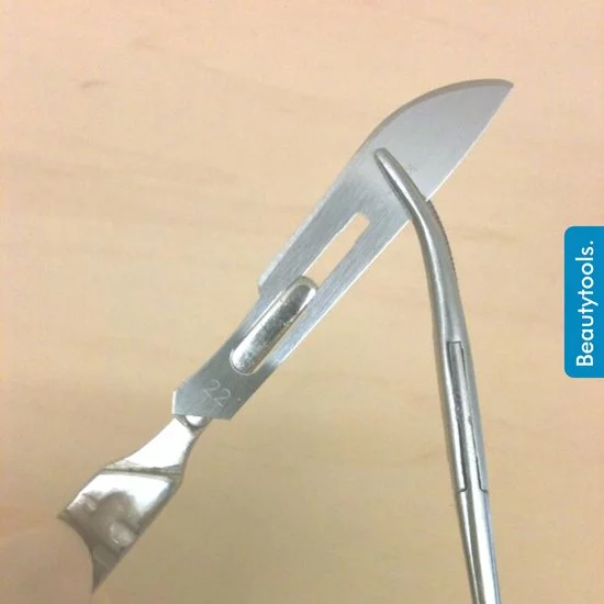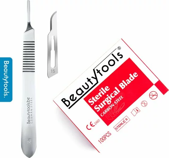 BeautyTools Scalpel Set BP-0676 bevat een platte bistouri houder Nr. 3 en 100 scalpelmesjes Nr. 15. De mesjes zijn steriel en individueel verpakt. Deze scalpelmesjes worden in pedicure gebruikt voor het wegsnijden van hardnekkige en overtollige eelt aan de voeten. Pedicure mesjes nr.15 zijn ideaal voor het verwijderen van eeltpitten, eksterogen en likdoorns. Hierbij is het dus belangrijk dat je steriel materiaal gebruikt.