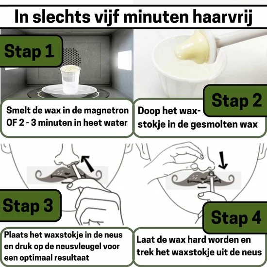 De sterke wax neemt 95% van de neusharen mee en zorgt voor een haarvrije neus tot wel 30 dagen. De set wordt geleverd met 70 gram wax beans en 20 wax stokjes. Dit zorgt ervoor dat je maar liefst zeven tot tien keer je neus kunt ontharen. Daarbij ontvang je tien snor beschermers om de haren te beschermen die je liever niet kwijt wilt. De wax is ook te gebruiken voor het verwijderen van oor- en gezichtshaar.