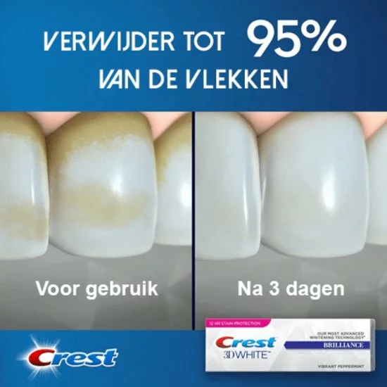 De revitaliserende formule van Crest 3D White Brilliance additionele tandpasta beschermt gedurende 24 uur actief tegen oppervlakkige verkleuringen door twee keer per dag poetsen.