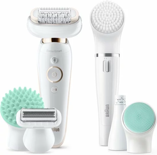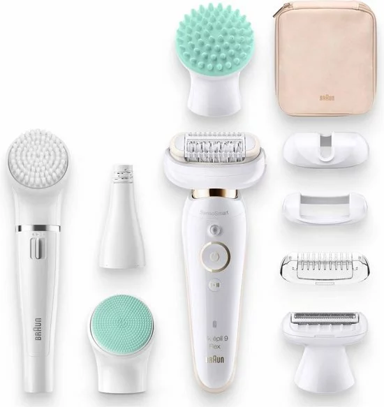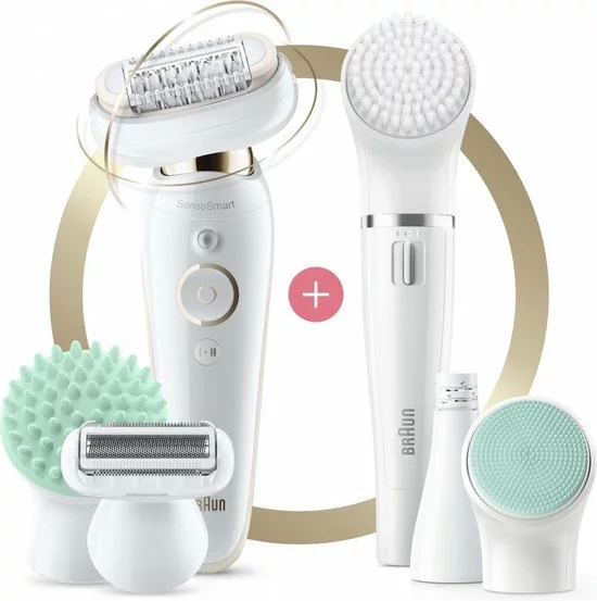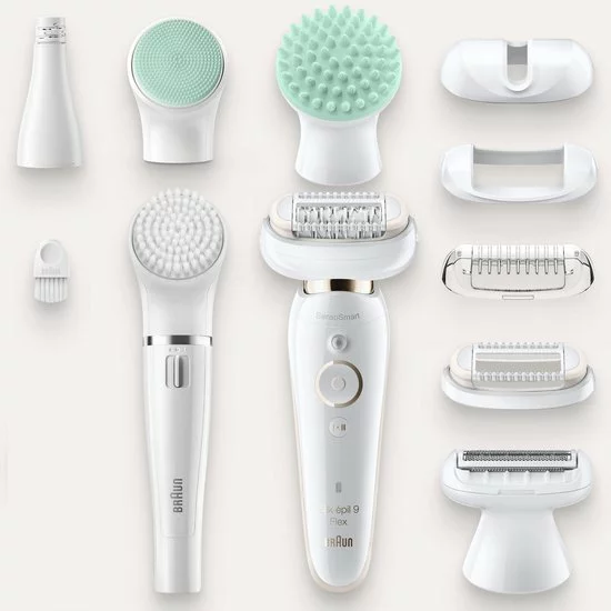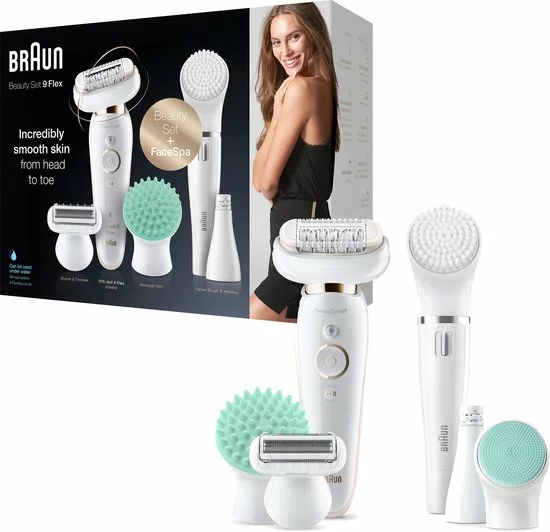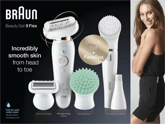 De Braun silk-épil beautyset 9 Flex met ‘s werelds eerste epilator voor vrouwen met een volledig flexibel hoofd, voor moeiteloze ontharing. Geniet wekenlang van een gladde huid dankzij de Micro-Grip-technologie en een 40% bredere kop die haartjes verwijdert van 0,5 mm, epilator, epileerapparaat. De beautyset bevat 4 extra opzetstukken, zodat je kunt scheren, trimmen, masseren en scrubben, plus FaceSpa met een gezichtsepilator, epileerapparaat, reinigingsborstel om huidonzuiverheden weg te halen, en een massageopzetstuk voor huidvitaliteit.