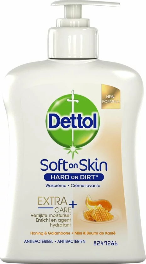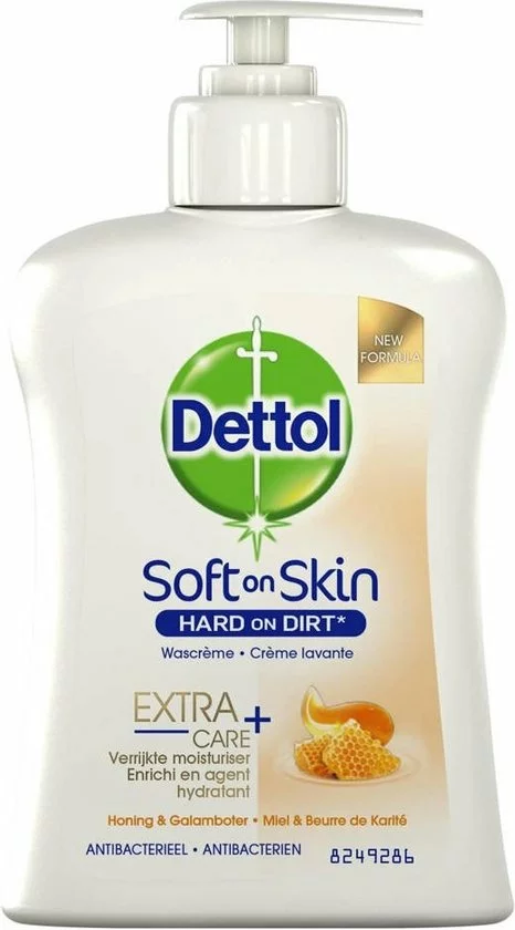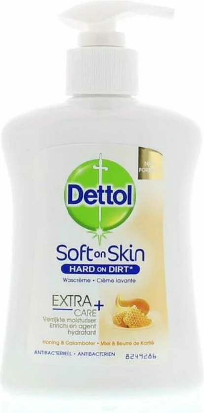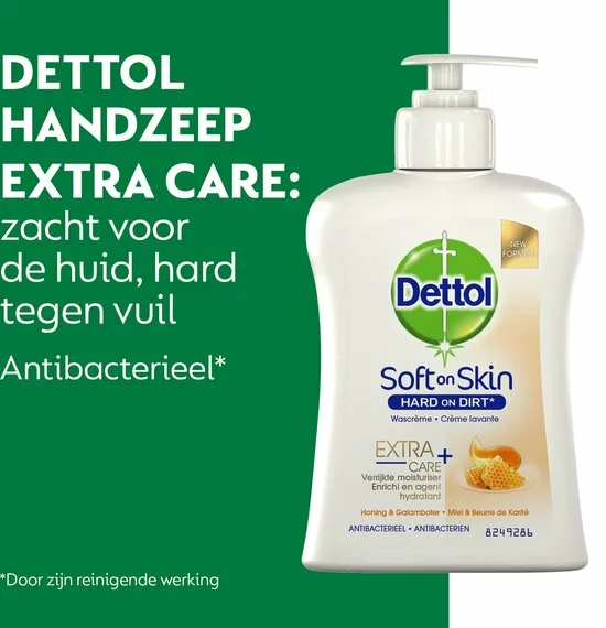 Dettol Antibacteriële Extra Care+ zeep voor handen biedt een extra verzorging, voor een extra zacht gevoel. Dettol Extra Care+ met de heerlijke geur van Manuka-honing en Galamboter beschermd de natuurlijke vochtbalans van de huid gedurende 3 uur en helpt tegen de verspreiding van bacteriën. Dettol Extra Care+ Handzeep – Extra zacht voor de huid, hard tegen vuil en bacteriën. Voor normale en droge huid.