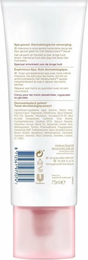 Dove DermaSpa Intensive Handcrème is onderdeel van de Dove DermaSpa lijn. Deze lijn is speciaal ontwikkeld om je thuis een spa-gevoel te geven om zo de drukke werkelijkheid even te kunnen ontvluchten. Als de huid van je handen extreem droog of zelfs gebarsten is, heb je de verzorging van een goede handcrème nodig. Verwen je extreem droge handen met onze speciale Dove DermaSpa Intensive handcrème.