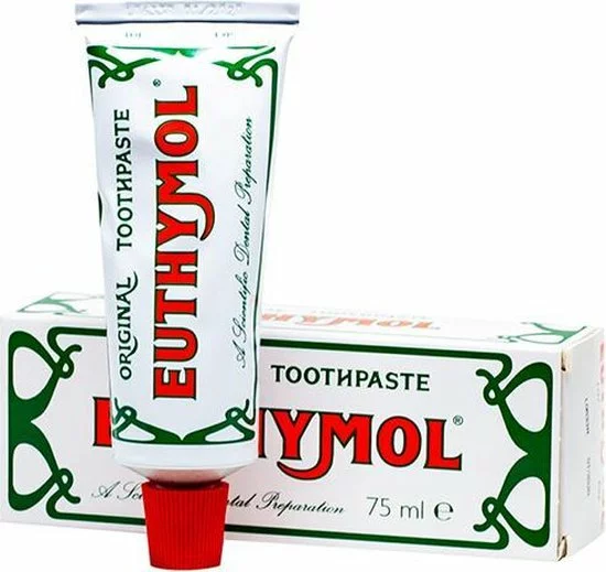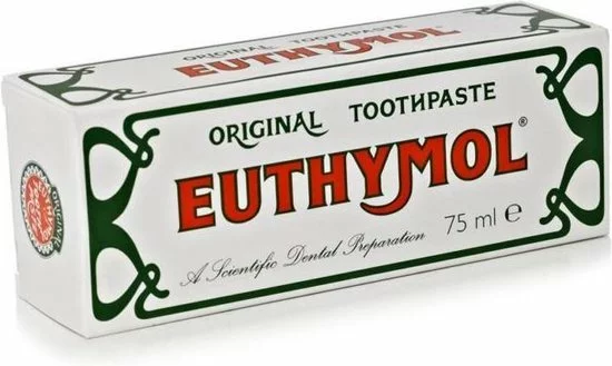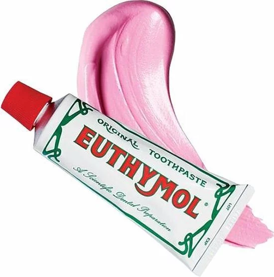 De fluoride-vrije Euthymol Whitening tandpasta geeft je een sterk gevoel van frisheid en zorgt voor wittere tanden. De tandpasta heeft een unieke roze kleur en zit in een mooie vintage verpakking, de tandpasta zal er dus mooi bij staan in je badkamer! Vanwege de anti-tandplak ingrediënten worden je tanden beschermd tegen tandplak, tandsteen en gaatjes. Daarnaast blijft je tandvlees en gebit gezond en schoon vanwege de antibacteriële en desinfecterende werking van de tandpasta. De Euthymol Whitening tandpasta van 75 ml heeft een zeer frisse en medicinale smaak. Tevens is het een middel dat werkt tegen aften.