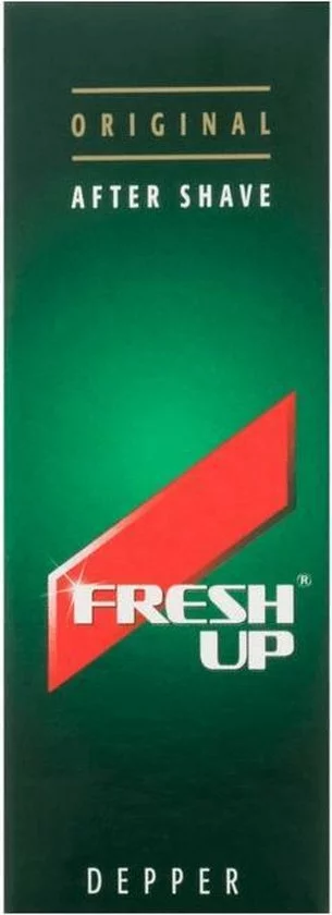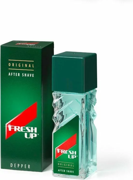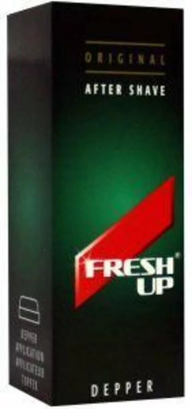 Fresh Up aftershave depper, tintelfris en huidversterkend. Ook na elektrisch scheren. Fresh Up is de enige vloeibare aftershave met depper, het sponskussentje dat morsen onmogelijk maakt. Fresh Up aftershave geeft na het scheren onmiddellijk een fris en verzorgd gevoel. Het is van belang je huid na het scheren goed te verzorgen anders bestaat de kans op ingegroeide baardharen. Dit kan puistjes opleveren die kunnen gaan ontsteken. Met name mannen met krulhaar kunnen daar last van hebben. Het gebruik van after shave met alcohol kan ervoor zorgen dat de poriën van de huid zich direct na het scheren sluiten waardoor het ingroeien van baardharen wordt voorkomen. Speciale ingrediënten als menthol en hamamelis virginiana verzorgen en verkoelen de huid na het scheren. Hamamelis virginiana heeft bovendien een verzachtende werking en ondersteunt het herstellend vermogen van de huid na het scheren. Glycerine heeft een vochtregulerende werking en zorgt voor een glad huidgevoel na iedere scheerbeurt.