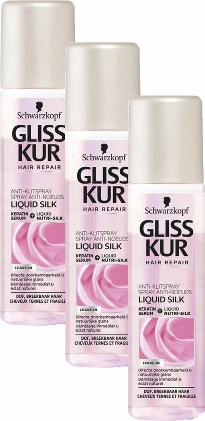 Gliss Kur Liquid Silk Gloss is de allereerste haarverzorging met Liquid Silk technologie; de zijdezachte touch voor glansloos, onhandelbaar haar. De Anti-klit spray zorgt voor doorkambaar haar met een mooie glans en zonder klitten. Verzorgt het haar en geeft tot 130% meer glans.