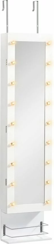 Deze vrijhangende juwelenkast is ideaal voor iedereen die op een elegante manier ruimte wil besparen in huis. Het frame is gemaakt van MDF, waardoor het duurzaam en betrouwbaar is voor dagelijks gebruik. Het is afgewerkt in een lichte tint wit om het er eenvoudig en mooi uit te laten zien. Rond de voorspiegel zorgen 18 retrolampen voor zachte verlichting die wordt aangestuurd door een schakelaar op de accubak.