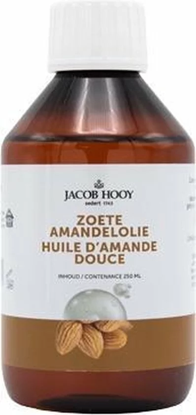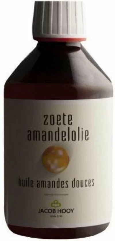 Jacob Hooy Amandelolie Zoet is een bleekgele, nagenoeg reukloze en dunvloeibare olie met een milde nootachtige smaak bereid door persing uit de fijngemaakte zoete amandel. Deze olie is koud geperst, niet vluchtig en huidvriendelijk. Het is een weldaad, vooral voor de droge huid. Zoete amandelolie regelt het vochtgehalte, heeft voedende eigenschappen en gaat de vorming van rimpels tegen. Kan zowel in- als uitwendig gebruikt worden. De meest simpele toepassing is iedere avond wat van deze olie zacht in de huid van gezicht, hals en décolleté te masseren.