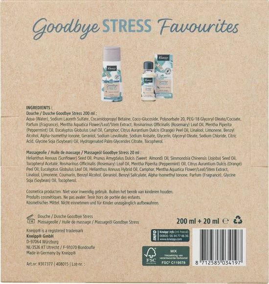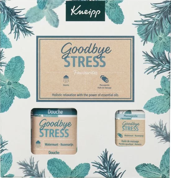 Geniet van de natuurlijke Kneipp® Goodbye Stress producten. De opwekkende en verfrissende geur met natuurlijke essentiële rozenmarijnolie en watermuntextract helpt je om een hectische dag achter je te laten. Deze geschenkset bevat een Goodbye Stress douche gel 200ml en een Goodbye Stress massageolie 20ml.