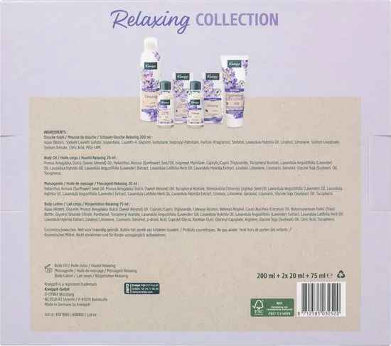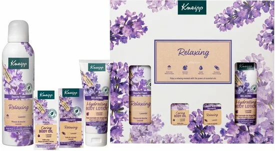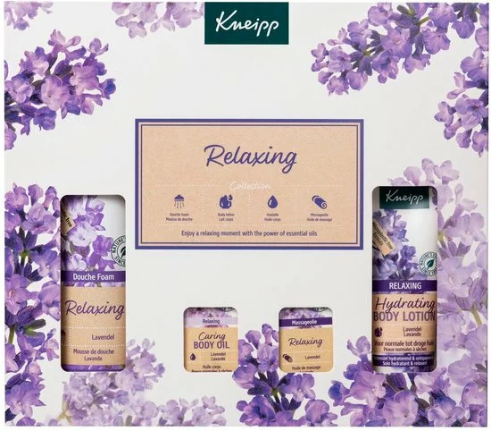 Geniet van een moment van pure ontspanning met de Kneipp® Relaxing Collection producten. Geniet van een moment van pure ontspanning. Deze geschenkset bevat een Relaxing douche foam 200ml, Relaxing body lotion 75 ml, Relaxing huidolie 20ml en een Relaxing massageolie 20ml.