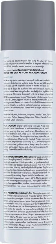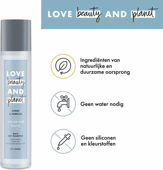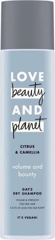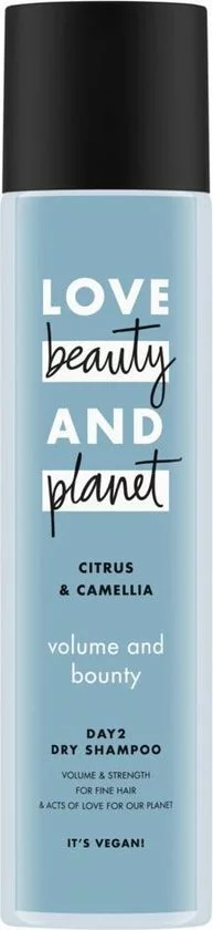 Bij Love Beauty and Planet geloven we in effectieve natuurlijke verzorgingsproducten, ofwel in beauty zonder consessies. We zijn onze reis begonnen door onze verzorgingsproducten te combineren met Small acts of Love voor de planeet. Al onze flessen zijn gemaakt van 100% gerecycled plastic en zijn recyclebaar. Bovendien werken wij samen met duurzame lokale ondernemers die zich, net als wij, inzetten voor het hergebruik van materialen. Bespaar tijd voor jezelf en water voor de planeet! Of je nu je ochtenddouche hebt overgeslagen of alleen een “pick me up” nodig hebt, Love Beauty and Planet Volume & Bounty droogshampoo verfrist je haar onmiddellijk met de heerlijke geur van fruitige citrus en camelia. Ook geeft deze haarspray volume aan futloos en slap haar.