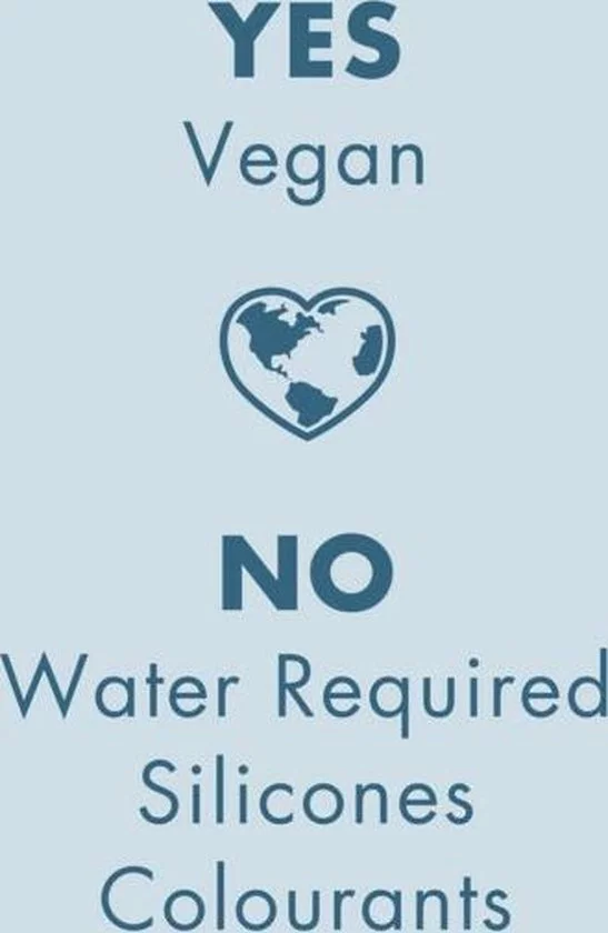 - JA vegan JA met natuurlijke en duurzame ingrediënten NEE geen water nodig NEE siliconen NEE kunstmatige kleurstoffen