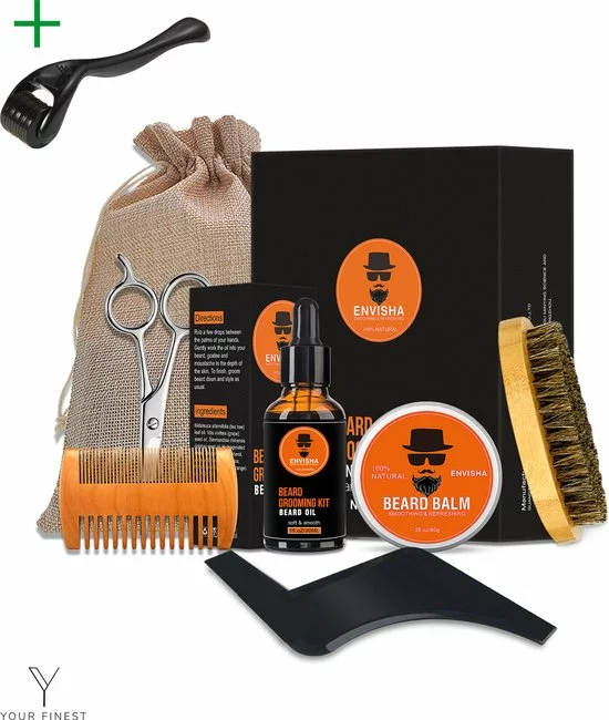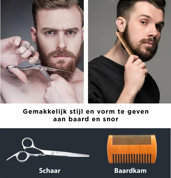 Deze achtdelige set van bevat baardolie, baardbalsem, Anti-klit kam, baardborstel, baardschaar, shaping tool, baardroller en opbergtas. Dit alles komt in een handige en sierlijke verpakking: een echt geschenk set dus!