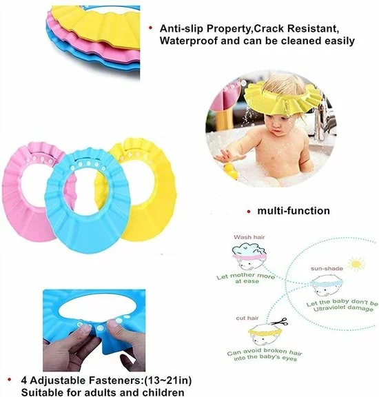 Dankzij dit douchekapje krijgt je kind of baby geen zeep meer in zijn ogen! De douchepet is ideaal voor kinderen of baby’s die het vervelend vinden om in de douche of bad te gaan. Het is een echte shower cap en is tegelijk een schattige pet. De douche kap is veilig voor ieder kind of baby. In zowel de douche als in bad!