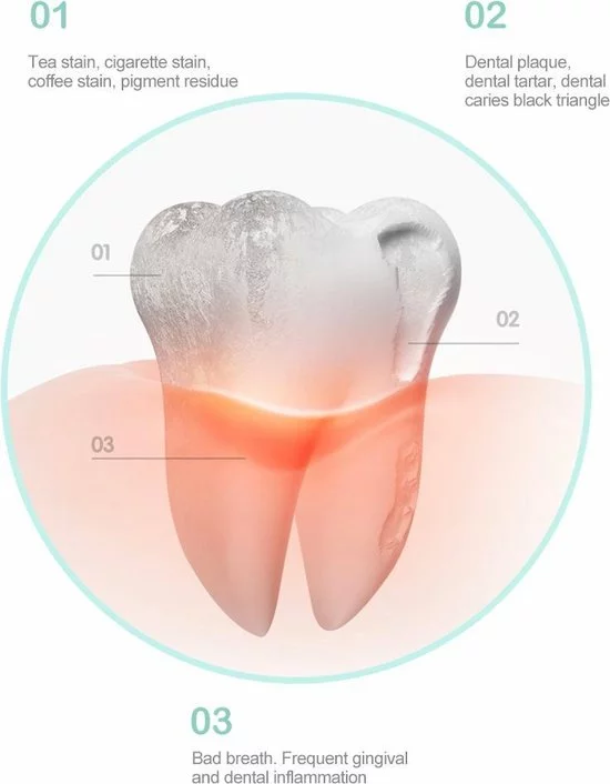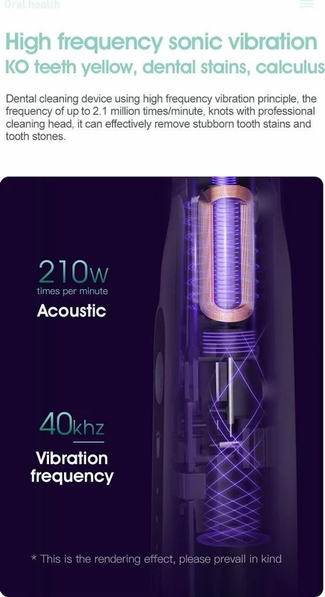 verwijder tandplak, tandsteen en tandvlekken.Met hoogfrequente trillingen (40Khz) -technologie om daar effectief in te reiken