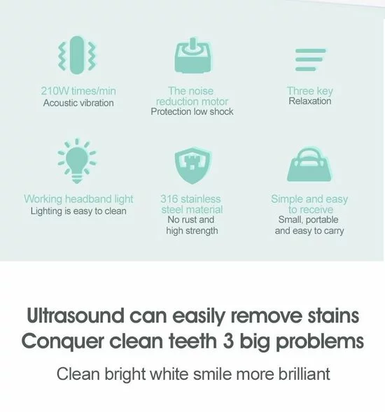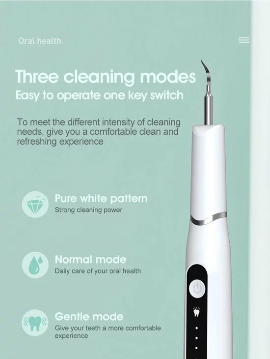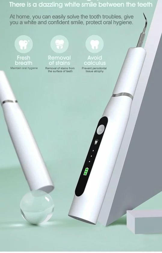Tarter-reiniger handig om op elk moment op te laden. LED-licht en mondspiegel zorgen voor veiligheid tijdens het tandenpoetsen, en