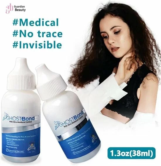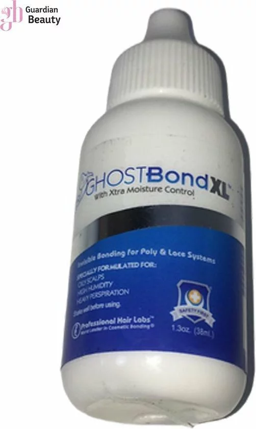 The liquid glue from Pro Hair Labs Ghost bond XL is a new, even stronger formula that does away with skin oil and perspiration. It is intended for both lace hairpieces and hairpieces with an adhesive edge.