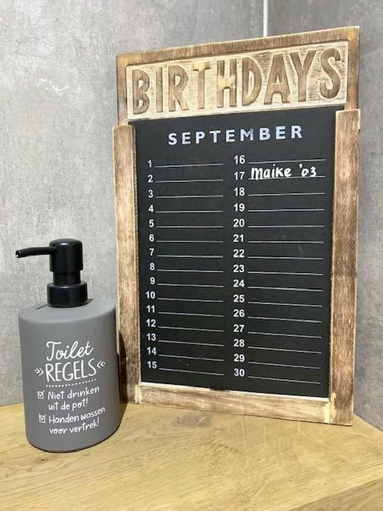 Houten verjaardagskalender (35 x 22 cm) + zeeppompje toiletregels