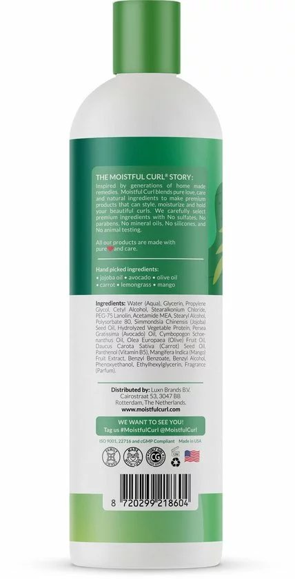 INGREDIENTEN: Water (Aqua), Glycerin, Propylene Glycol, Cetyl Alcohol, Stearalkonium Chloride, PEG-75 Lanolin, Acetamide MEA, Stearyl Alcohol, Polysorbate 80, Simmondsia Chinensis (Jojoba) Seed Oil, Hydrolyzed Vegetable Protein, Persea Gratissima (Avocado) Oil, Cymbopogon Schoenanthus Oil, Olea Europaea (Olive) Fruit Oil, Daucus Carota Sativa (Carrot) Seed Oil, Panthenol, Mangifera Indica (Mango) Fruit Extract, Benzyl Benzoate, Benzyl Alcohol, Phenoxyethanol, Ethylhexylglycerin, Fragrance (Parfum).