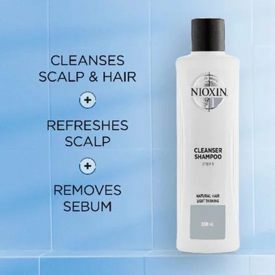 De Nioxin System 1 Cleanser is een reinigende shampoo die speciaal is ontwikkeld voor normaal tot dun en fijn uitziend haar. De System 1 Cleanser vergroot de haartextuur en verfrist de hoofdhuid. De shampoo helpt bij het verwijderen van talg, dat de haarfollikels verstopt, vetzuren en stylingproducten op de hoofdhuid en uit het haar. Het haar zal er dikker en voller uitzien.