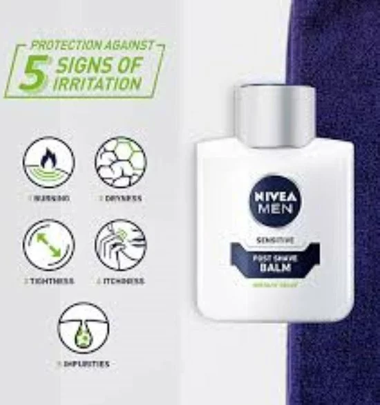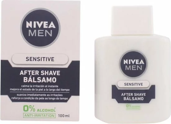 NIVEA MEN Sensitive Aftershave Balsem is speciaal ontwikkeld voor mannen met een gevoelige huid die hun geïrriteerde en rode huid onmiddellijk willen verzachten. De formule met 0% alcohol is extra zacht. Verrijkt met Kamille en Hamamelis, trekt het snel in en verzacht het je huid na het scheren zonder een vettig of plakkerig gevoel na te laten.