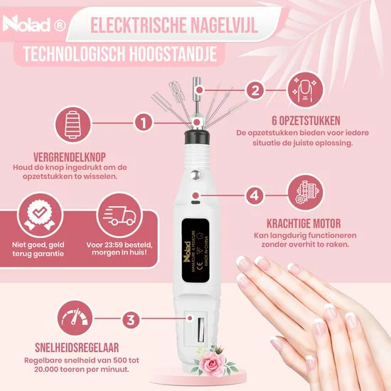 Hou jij net zoals ons van keurig verzorgde nagels? Zorg goed voor jouw nagels! Te lange nagels kunnen zorgen voor veel pijn en uiteindelijk zelfs gewrichtsproblemen, dit wil je voorkomen! Met Nolad´s elektrische nagelvijl zijn scherpe en te lange nagels weer kort en glad binnen enkele seconden! De elektrische nagelfrees van Nolad is een krachtige nagelvijl die volledig naar eigen wens is in te stellen dankzij het bedieningspaneel. Verwijder eenvoudig oude gel- en acrylnagels, werk de nagelriem bij en vijl je nagels eenvoudig in de gewenste vorm; met Nolad´s nagelvijl heb je in een handomdraai weer mooie nagels!
