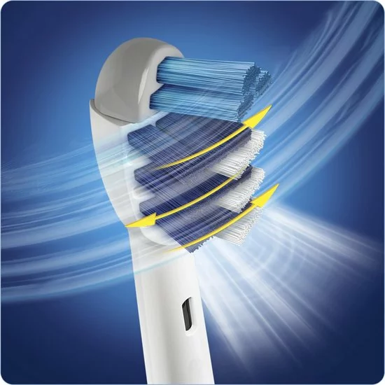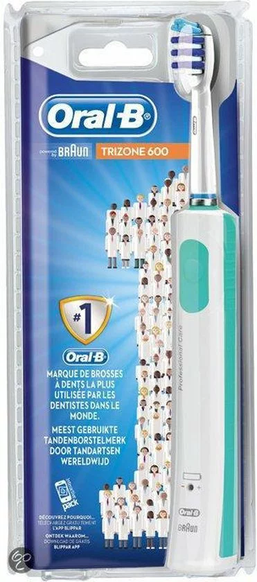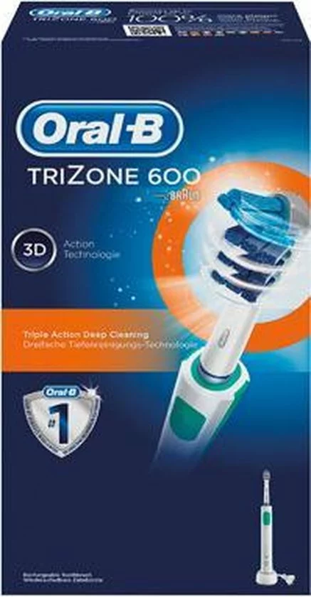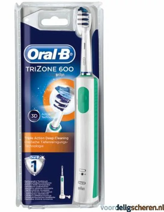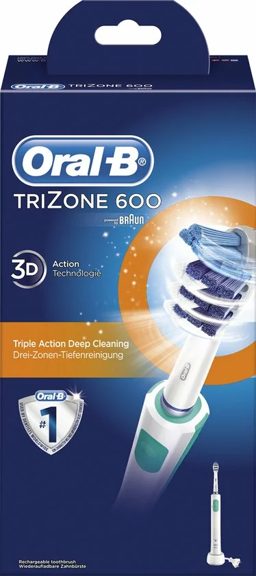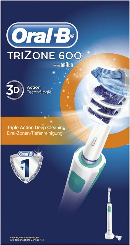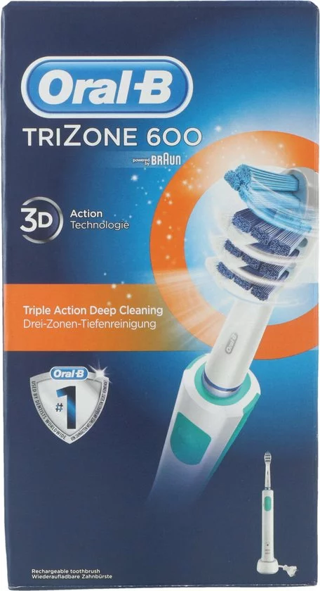 De Oral-B TriZone 600 elektrische tandenborstelkop heeft de vorm van de borstel van een manuele tandenborstel, maar is ontworpen om aanzienlijk beter te reinigen. Je kunt poetsen zoals je gewend bent, maar je verwijdert veel meer tandplak. Laad de elektrische tandenborstel op en activeer de drie speciale reinigingszones. De powertip maakt de achterkant van de tanden schoon, kortere borstelharen reinigen de tandoppervlakken en langere borstelharen reinigen diep tussen de tanden, voor een drievoudige reiniging. Eigenschappen: – 2 poetsstanden: Dagelijkse verzorging, Tandvleesverzorging – 2 minuten timer – Zichtbare poetsdruksensor Snelheid: – Oscillerende reinigingssysteem: 8800 bewegingen per minuut – Tandenborstel frequentie pulsaties: 20000 bewegingen per minuut Opzetborstels: – TriZone met dynamische drievoudige reiniging, met borstelharen indicator, de borstelharen geven aan wanneer de opzetborstel moet worden vervangen – Ook te gebruiken met alle andere opzetborstels van Oral-B zoals: CrossAction, Precision Clean, FlossAction, TriZone, Sensitive, 3D White