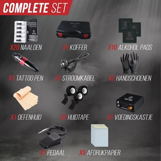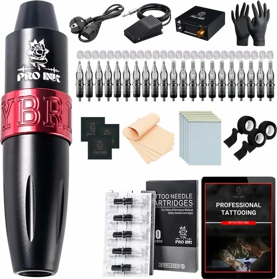 Bij aankoop van de machine ontvang je eveneens de nodige materialen om direct te kunnen starten met tatoeëren. Je ontvangt namelijk een PROINK® Tattoo Machine, verschillende naalden, een LCD voedingssysteem, een voetpedaal, een contact koord, een Europese voedingskabel, veiligheidshandschoenen , een opbergkoffer, grip tape, oefenhuid en carbonvellen. Hierdoor heb je alles bij de hand en bespaar je tegelijkertijd op je uitgaven.