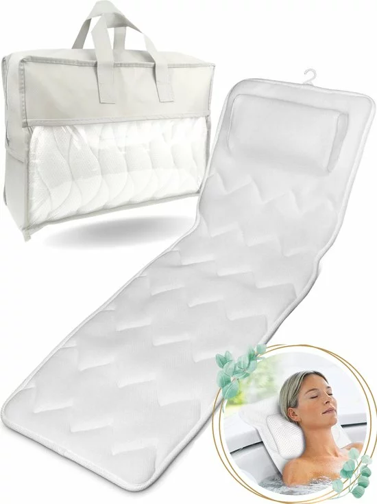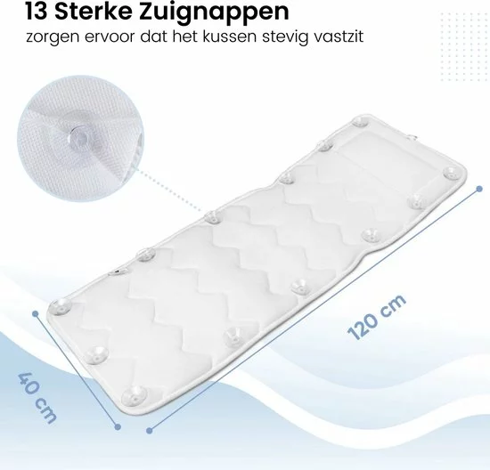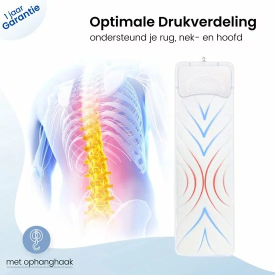 Met het full body badkussen is ontspannen geen probleem meer. De 13 sterke zuignappen houden het kussen perfect op zijn plaats. Samen met het 3D mesh materiaal dat extreem ademend en sneldrogend is, biedt het de optimale drukverdeling voor rug, nek en hoofd.