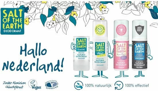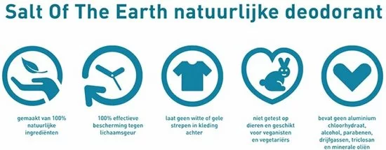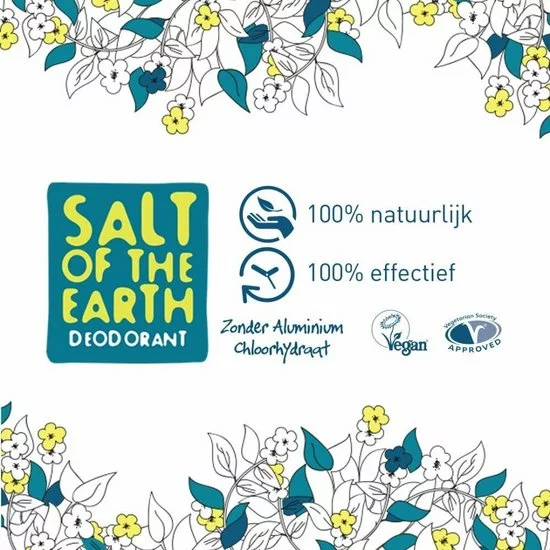 Bescherm jezelf tegen transpiratiegeuren met deze 100% natuurlijke, geurloze en verzorgende deodorant. Salt of the Earth Natuurlijke Deodorant bevat geen aluminiumchloorhydraat, alcohol, parabenen of triclosan.