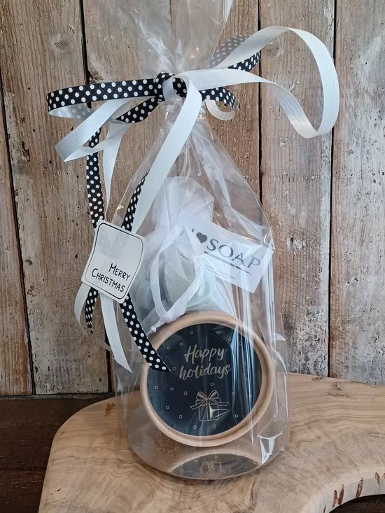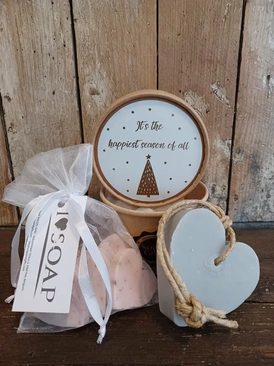 In het pakket vindt u een doosje zeep met bovenstaande tekst en een grijze zeep aan koord. Samen met een organza zakje, gevuld met zeephartjes: geur Wild Roses, van 7 stuks á 10 gram, heeft u een prachtig cadeau om te geven.