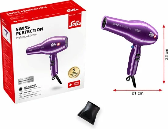 De Solis Swiss Perfection föhn is geen doorsnee huis-tuin-en-keuken föhn, maar een professionele haardroger dankzij de riante luchtdruk (+50%) en luchthoeveelheid (+40%). Dat maakt de föhn geschikt voor zowel fijn en dun haar als zwaar en vol haar.