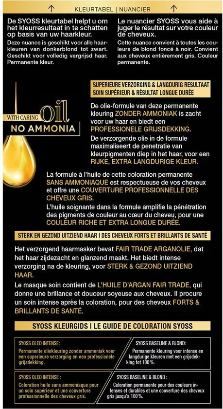 Syoss Oleo Intense: door de kracht van 100% pure oliën een ultieme kleurintensiteit. Zonder ammoniak. Professionele kwaliteit voor een betaalbare prijs.
