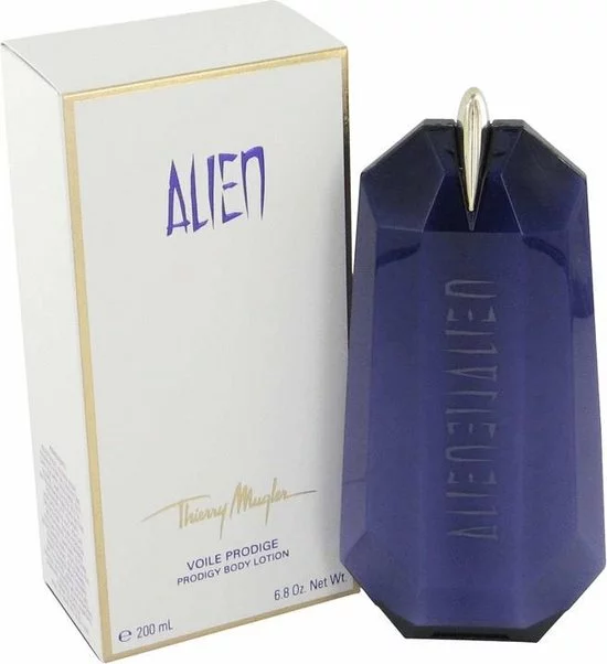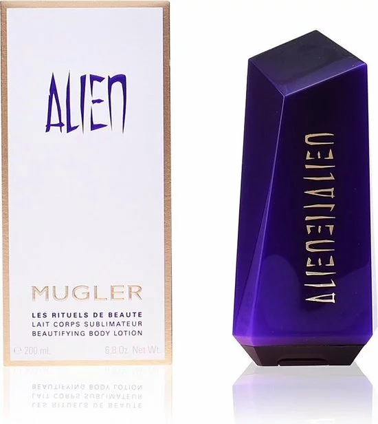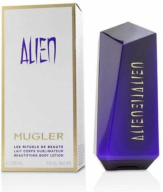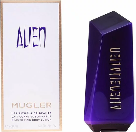 Thierry Mugler Alien bodylotion. MUGLER Alien Bodylotion 200 ml bevat de weldadige geur van de Eau de Parfum Alien. Dankzij het Complexe Sublimateur d’Eclat verfraait en verheldert de Lait Corps Alien de huid. Er vindt een intense hydratatie plaats, waarbij de huid royaal wordt geparfumeerd. De huid wordt stralend, zacht en mooi. De bodylotion zit in een nieuw geslepen flacon, waarbij het design geïnspireerd is op de tijdloze talismanflacon van de parfum. MUGLER leidt ons met Alien naar een wereld die doordrenkt is met een aura. Het parfum MUGLER Alien is opgebouwd uit drie ontdekkingen: bloemsoorten, houtsoorten en ambernoten. De ingrediënten van Alien zijn onder andere: jasmijn, amber, oranjebloesem en vanille. Vrouwen die het parfum Alien dragen zijn dan ook gedurfd, stoer, vrouwelijk en een tikkeltje mysterieus. Het flacon van Alien is al net zo magisch als het parfum. Wil je dat de geur MUGLER Alien nog langer behoudt? Gebruik dan ook de MUGLER Alien Bodylotion 200 ml.