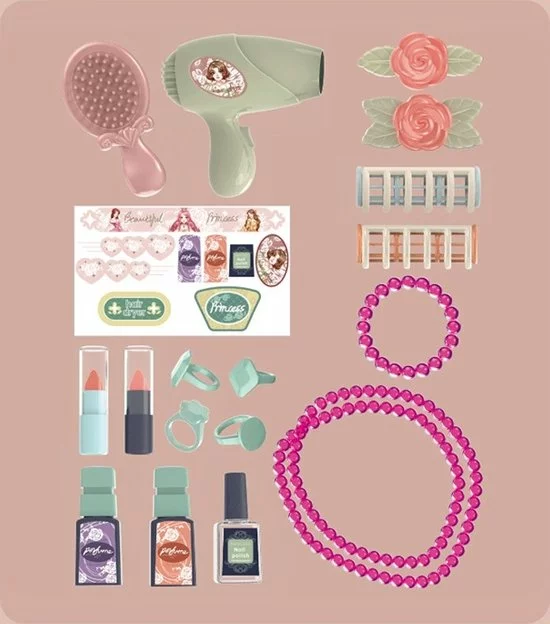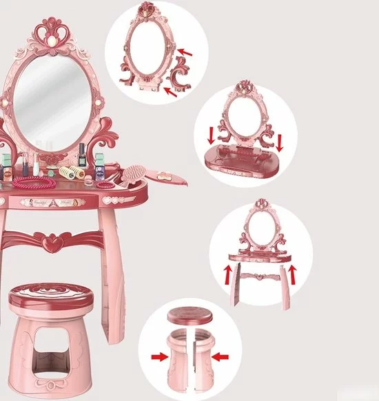 De make up tafel is fel gekleurd met een echte spiegel. Deze kaptafel voor je kind bevat alles waar je kleine prinses van kan dromen. Een geweldig speelgoed voor meisjes die graag spelen in een schoonheidssalon of kapper. Ook andere beauty-gerelateerde details, zoals elastiekjes, spelden of sieraden, kunnen op de kaptafel worden gelegd.