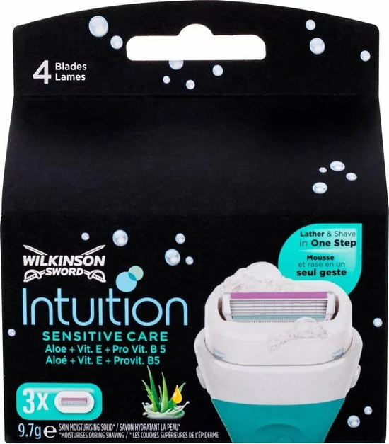 Intuition Plus Sensitive Care Scheermesjes schuimen, scheren en hydrateren in één enkele beweging, dus voeg alleen wat water toe. Let op: Nu met 4 scheermesjes op rij! Een aparte scheergel of mousse is nu niet meer nodig. Naast aloë vera en vitamine E bevat de crèmezeep karitéboter, dat je huid tijdens het ontharen van extra hydratatie voorziet.